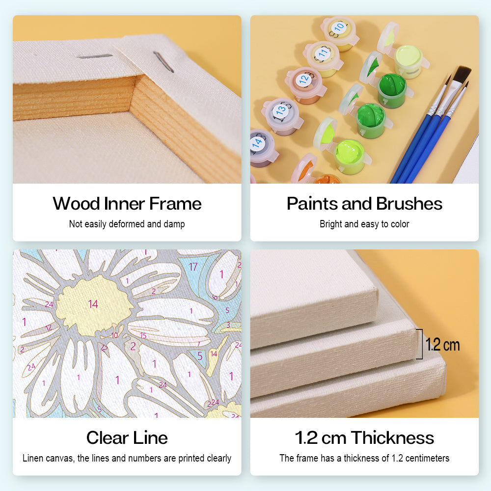 Paljasta kaikki olennaiset asiat siististi pakattuina Paint by Numbers -pakkaukseemme. Kun jokainen komponentti on merkitty ja käyttövalmis, voit keskittyä yksinomaan taiteelliseen matkaasi. Eloisista maaleista tarkkuussiveltimiin olemme varmistaneet, että mikään ei ole sinun ja kankaasi välissä. Tämä sarja sopii sekä aloittelijoille että kokeneille taiteilijoille, ja se tarjoaa puhtaan, keskeytymättömän maalauskokemuksen.