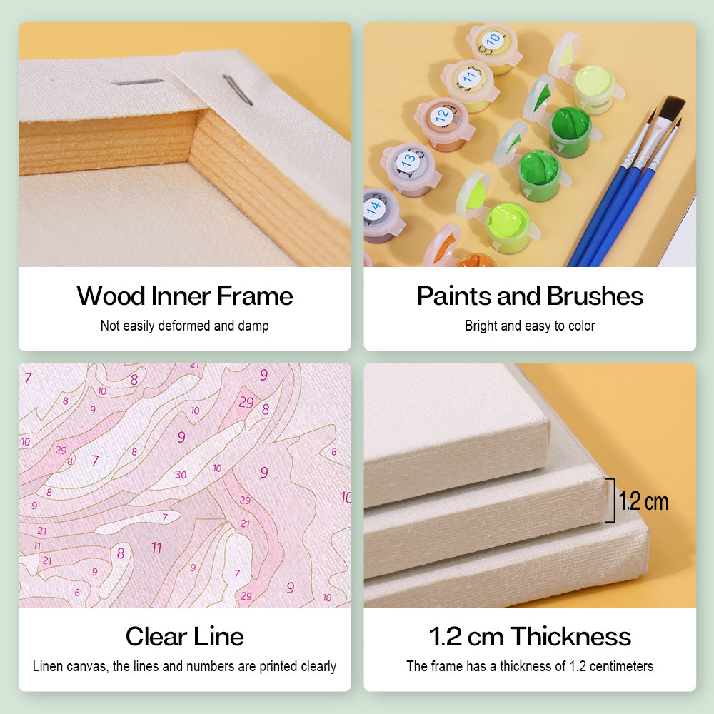 Paljasta kaikki olennaiset asiat siististi pakattuina Paint by Numbers -pakkaukseemme. Kun jokainen komponentti on merkitty ja käyttövalmis, voit keskittyä yksinomaan taiteelliseen matkaasi. Eloisista maaleista tarkkuussiveltimiin olemme varmistaneet, että mikään ei ole sinun ja kankaasi välissä. Tämä sarja sopii sekä aloittelijoille että kokeneille taiteilijoille, ja se tarjoaa puhtaan, keskeytymättömän maalauskokemuksen.