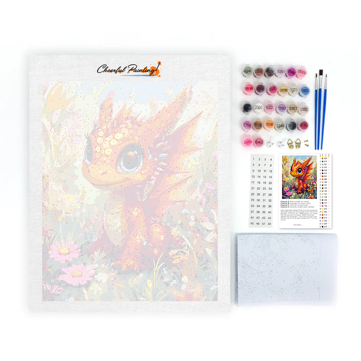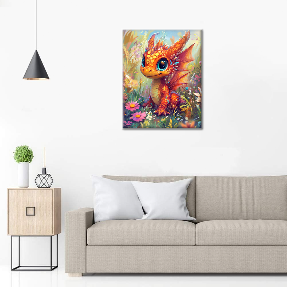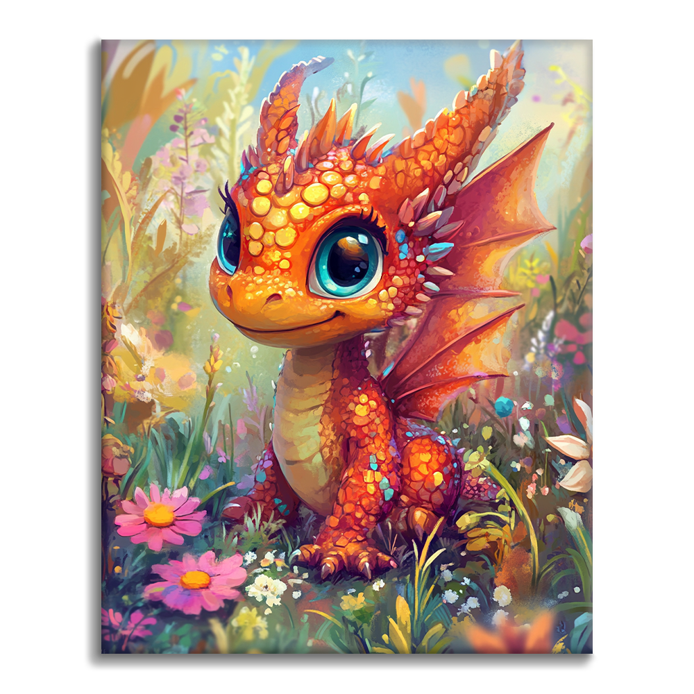 Oranssi lohikäärmeenpentu kukkien ihmemaassa - Maalaa numeroilla